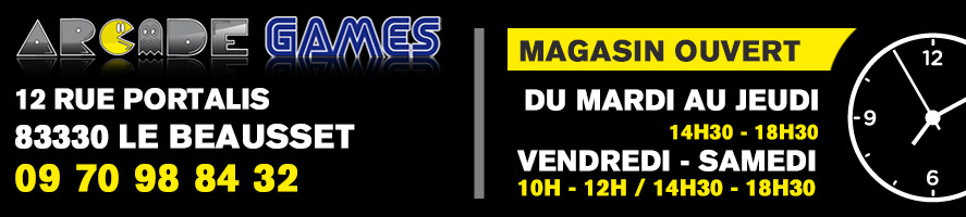 Arcade Games - Magasin de jeux vidéo au Beausset dans le var propose achat et vente de produits d'occasions de toutes marques : Playstation 1, playstation 2, playstation 3, Playstation 4, Xbox, Xbox 360, Xbox One, Sega Megadrive, Super Nintendo, Gamecube, Psp, DS, 3DS, Gameboy ainsi que des produits collector tels que Vidéopac, Vectrex, MSX etc...